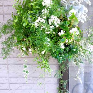 ホワイト&グリーンな、 爽やかなハンギングを作ってみました💕 ペトリエイのお花は、 来年のお楽しみということで😉 かけてる場所は、物干し竿の脇です(๑˃̵ᴗ˂̵)