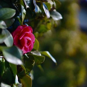 椿の蕾はまだ硬く、多少色づいてはきたがまだ咲かないようだ。と、裏側を見たら隠れるようにして、恥ずかしげに一輪咲いていた。 いじらしいじゃないの。 皆んなより先に咲いてしまい遠慮しているのかなぁ