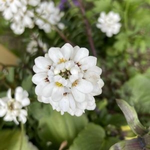 「イベリス」✨💕 シベがたくさんある花だなぁ、と思っていたら、 可愛い小花がたくさん集まっているんですね🔍👀 花弁は4枚で外側の2枚が大きくなるとのこと よく見るとわかりますね🐰😉 アブラナ科 イベリス属 和名 :「マガリバナ(屈曲花)」 「トキワマガリバナ(常盤屈曲花)」 英名 :「Candytuft(キャンディタフト)」 花言葉 :「心をひきつける」 「初恋の思い出」「甘い誘惑」