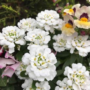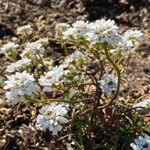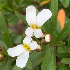 1月30日撮影 奥武蔵 能仁寺の横にできた発酵テーマパークの植え込みにありました。 可愛らしい花です。 この花を投稿されている方の植物名がイベリスとなっていて、調べると 和名トキワナズナ、マガリバナ…とありました。 ところが、トキワナズナで検索すると この花とは違う形の花が出てきました。 もう一つの和名マガリバナの方がこの花の画像が出てきましたよ。 トキワマガリバナ (イベリス、トキワナズナ、マガリバナ) アブラナ科マガリバナ属 日本へは明治時代に渡来。 4弁花ですが、内側の2弁が小さく外側の2弁が大きいので花の形がアンバランスなことから、和名をマガリバナ(曲がり花)と言うそうです。