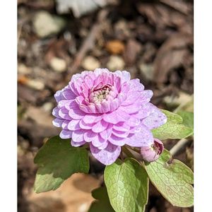 【バイカカラマツ(梅花落葉松)】 北アメリカ原産、キンポウゲ科多年草 明るい樹林帯の林床に生え、カラマツソウの仲間に似た草姿で、春に花径2~3㎝のアネモネのような花を咲かせる。 基本種は一重の花で、茎の先端に一輪ずつ開花する。 品種改良によって現在では、八重咲きや千重咲きの花もあり、色も白やピンク、淡桃色、淡緑色など様々な種類がある。 花弁はなく、萼が花びらのように見える形状をしている。 草丈:15~20cm、 開花期:4月~5月 花色:桃紫色、桃色、白色 ガーデンマルシェ防府にて