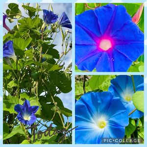 今日のお花 アサガオ 畑で2種類咲いています 天上の蒼とケープタウンブルー 今朝数えてみたら合わせて26個咲いていました☺️