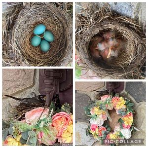 ミシガンから 玄関ドア横のリースに造られた鳥(ロビン)の巣 続報 卵🪺は4個、ヒナがかえっていると夫から写真が届きました 私が戻る頃までいてるかな?