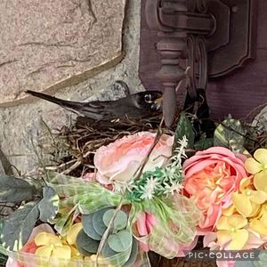 鳥の巣🪺がリースに‼︎ ミシガンにいる夫から、玄関ドア横に飾っているリース(造花)に鳥(ロビン)が巣を作っていると報告ー しばらくこのドアは使えません (出入りはガレージから可能)