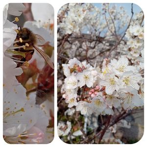 お久し振りです、暖かくなり、お花も次々咲いてきて、賑やかです😆🎶🎶 この暖かさで、サクランボが、満開になりました😊☀️☀️ ミツバチ達も忙しそう🐝🐝🐝