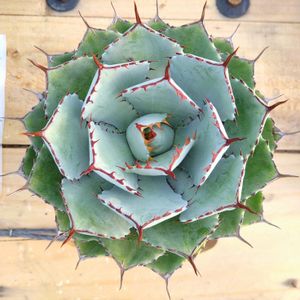 とうとうアガベお迎えです 近くのファーマーズマーケットで出会ってしまいました❣️ 名前は吉祥冠とついてました 調べてみると幸福、幸運、冠の意。 艶のある短い赤茶色の鋸歯が魅惑的 と‥ 即買いです! 現在のサイズ直径10センチ程大きくなるのが楽しみです♪