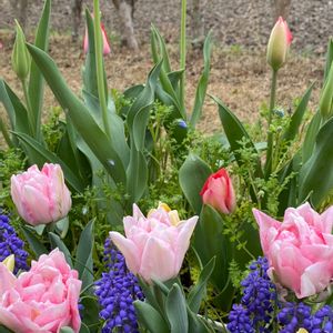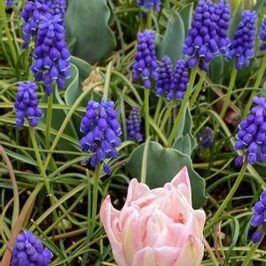 プランターに植えた チューリップ(品種名は不明です😅) ムスカリ アルメニカム(たぶん😅) 10球植えのチューリップ🌷 ひとつだけ 早く咲きました。 ムスカリは5年くらいになります。 丈夫で どんどん増えてます💦 秋に 密になったムスカリを植え替えて チューリップを一緒に植えました。 うまく一緒に咲いてくれて嬉しい😊
