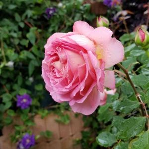 薔薇ジュビリーセレブレーション 好調✨最初の蕾がひらいてから6輪開きました。 花首が細いのでしだれやすいけど、☔だと余計ですね 本当によい香り😌 クレマのキリテカナワをバックに