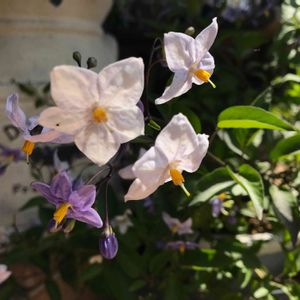 この子は何というお名前でしょうか?? 今年1月にお花屋さんのマルシェで買ったお買い得バスケット(見切り品😅)の中に入っていたのですが、名札がなく何のお花かわからないまま育てて今月半ばにお花が咲きました。 咲き始めは薄紫色、咲き進むにつれて白く変化するようです。 ※回答頂きました! 【ツルハナナス】のようです💜 ナスの花に似てるなぁ〜と思っていました。 ありがとうございました🙏