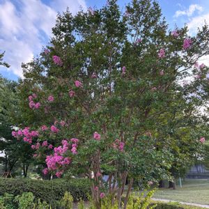 近くの公園に草刈り隊が出動してくれました❗️ ①〜③ スッキリした公園に咲き始めたピンクの「サルスベリ」が映えます🩷 ④ 他の場所の白のサルスベリ🤍 ピンクより先に咲いてました😊