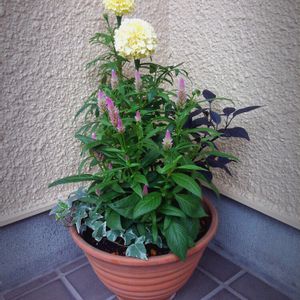 ピンクのケイトウを主役に寄せ植え。 コンパクトにすっきりさせて、夏っぽくなったかなぁ?😜 すぐ盛り盛りしてきそうだけど💦