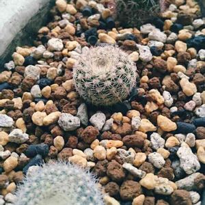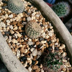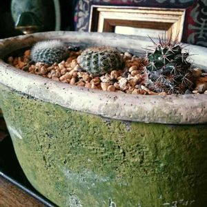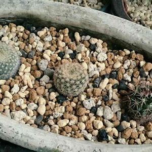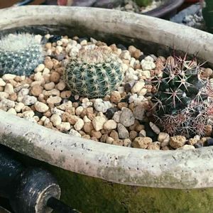 真ん中のサボテンの名前を知っていたら教えて下さい。よろしくお願いします! ノトカクタス属です。ヘルテリーのような気もします。トゲは頭の方が赤茶で、次第に白いトゲになっています。