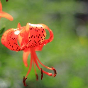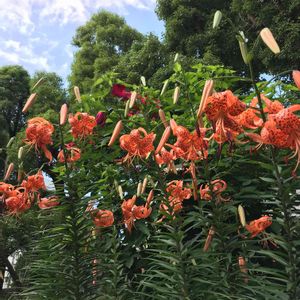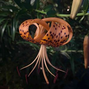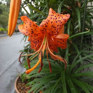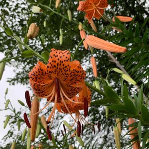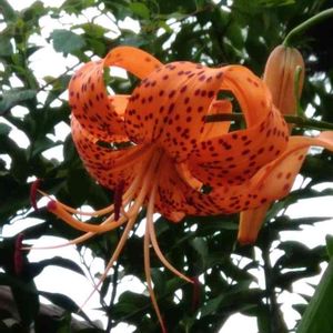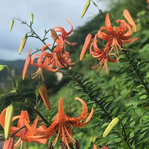 オニユリ 雨の中、今年初めての花が咲いてた。 晴れ間が出た。 急いで撮影。 何で、鬼👹ユリ? 鬼👹の履く、パンツの模様に、似てるから。 だって。 正確な事は、判りません。 ひとかぶから、17個の花が咲きます。