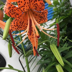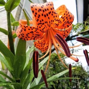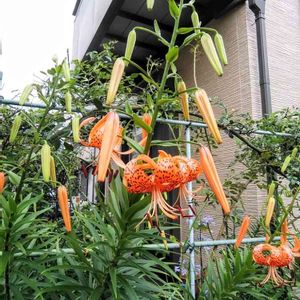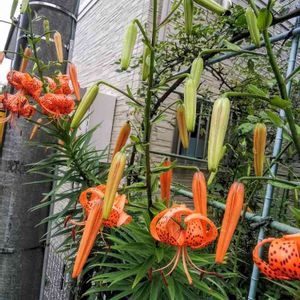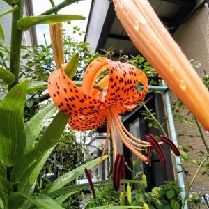 オニユリ 鬼百合 昨日、雨の中、1輪開花! 今朝、咲き進んでる。 鬼百合は茎にたくさん、ムカゴを付ける。 パラパラと、いろんな所に、落としていく。 25本、茎を上げてる。 鬼百合の家。 そう呼ばれてるかも😚