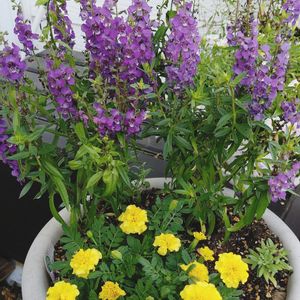おはようございます✋😊☁ アンゲロニアサンと零れ種のマリーゴールドサンの寄せ植えが、良い感じになって来ました🤗💓 鉢の右端には零れ種のアリッサムサンが植えて有りますが、暑さ🥵のせいでなかなか成長してくれません😟 👩「地植えのアリッサムサンは殆ど枯れたので、元気でいてくれるだけでもいいわ✌️😉」 台風🌀7号は近畿地方に上陸しましたが、被害が少ない事を祈ります🙏