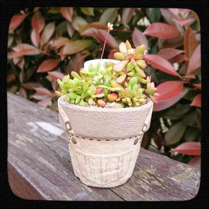 初めてお迎えした紅稚児を、多肉王子/たにくるさんのリメ鉢に♪