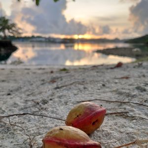 モモタマナの実。 海岸沿いの大きな木から落ちた実が砂浜にいっぱい。 かたーい実ですが、地元の人はこれを割って、種の仁を食べます。英名はトロピカルアーモンドというぐらいで、見た目はホントにアーモンドみたいです。味はそれほどコクはないけれど悪くはないです。