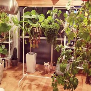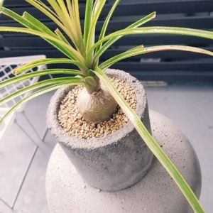 随分、葉がふえました。 夕立にうたれ、綺麗です。 鉢スタンドもモルタルにてDIY。