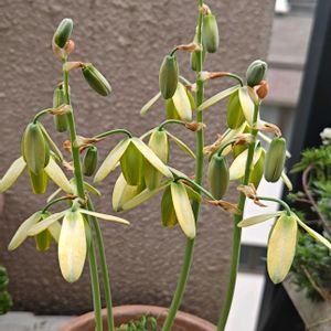 クルクル🌿のアルブカスピラリス フリズルシズルのお花が咲いていますꕤ…˖* ひと月くらい前から咲き始め、今は枯れ始めましたが、3回目の開花の今年は分球して二本の茎から15輪お花が咲きました(๓´˘`๓)