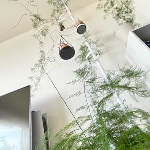 半年でここまできました😆 1月に天井に到着した、床置きのアスパラガスプルモーサスです。 その後、根本やツルの途中から極太のツルが出てきては好きに伸びて、この姿に。 この子もいい年なので今年は株分けしたいと思います🌿
