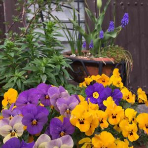 1日雨でした。 数日前のプランターのビオラ達 奥にはストック、つるバラ、ムスカリ、チューリップ🌷