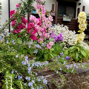 小雨が降ってます☔️ 玄関前の花壇に咲いているローズマリー💠とストック🌸🌼 ローズマリーは暴れん坊だけど這性が好き🤗💕