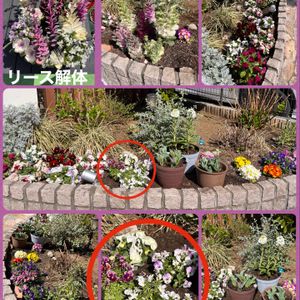 気合いを入れて、塔の立った葉牡丹撤去作業じゃー‼️ リースの葉牡丹と表花壇の葉牡丹を撤去。 リース解体で出たコクリュウや吉祥草はスリットへ ビオラ3種は、表花壇へ💦💦💦 その隣にいよいよ、花芽が出てきたチューリップの鉢植えと種まきストックがだいぶキレイになってきたので、真ん中へ🌷 ふぅ〜。これで5月までは何とかなるかな。 多少、鉢植え変えながら🪴 葉牡丹は結局、捨てられず、ダメ元で使用済み土の置き場に植えてみた😂😂😂