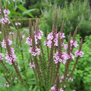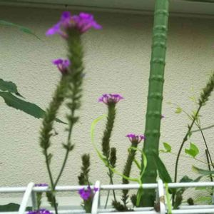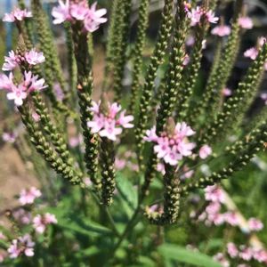 バーベナハスタータ ピンクスパイヤーの一番てっぺんの子が咲き始めました🚀🚀🚀 一緒にお迎えしたホワイトは100cmくらいだったのにピンクは160の私の身長を越えてしまいました😅 花壇の真ん中辺りに植えてしまい寄りかかるところもないので風で倒れそうで心配…