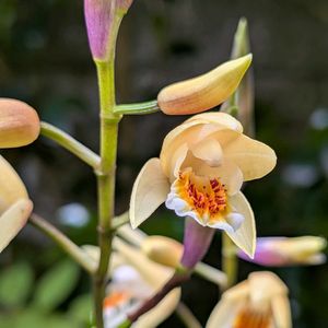 こんばんは〜 今日は暑かったですね💦 家の庭から… 1〜3 紫蘭(黄色) 4〜5ナツロウバイ 3年前に小さな苗木を いただいて、始めてお 花が咲きました~葉は 大きく枝先にお花が付 きます🌿お花は、夏椿 姫沙羅のような大きな 花です!🎶💕😄