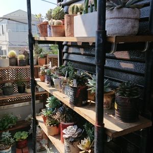 おはようございます✨ この塩ビ棚にもサボテンが‼️ それだけサボテンが増えてきたっちゃね〜☆ 毎回置場所に試行錯誤。 猛暑は続きそう。 工夫して乗り切りましょう‼️
