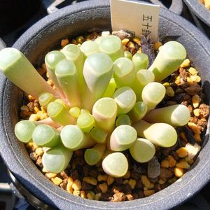 🟨フェネストラリア 五十鈴玉錦🟩 少しだけ斑入りの株ですが、今回は花の写真です。 冬型多肉植物の五十鈴玉は、おかしな形の葉っぱからは想像つかない、普通に綺麗な花が咲きます。 タンポポのように、昼頃に開花して夕方にはすぐしぼんでしまうようです。 五十鈴玉のそっくりさんに群玉という多肉植物がいますが、花の色で見分けられるそうです。五十鈴玉は写真の黄色で、群玉は白色らしいです。 色々な多肉植物を育てていますが、どうしても五十鈴玉は育てるのが苦手で、過去に何度も枯らしてきたのですが、今回初めて夏越しからの開花までくることができました。 鉢の置き場所をより風通しの良い場所にして、水を少なすぎず多すぎずうまいことやるようにすると、猛暑でもギリギリ夏越しできるようです。 冬越しも頑張ります!