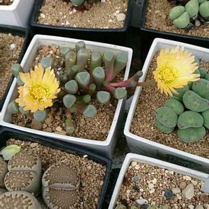 夏に半分くらい溶けたけどなんとか生き延びてくれたフェネストラリアに初めて花が咲きました🌼 黄色なので五十鈴玉でした! ちなみに白い花だと群玉だそうです。