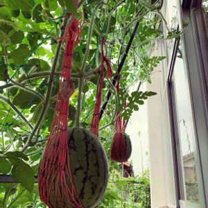 鉢植えスイカの、空中栽培✨~種から育てました、小さいですが立派にスイカです、もうすぐ収穫…可愛らしいです🎵🍉