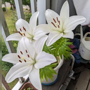 ベランダの百合が咲き始めました。 蕾から咲くまで何週間も待たされました。 やっと綺麗な百合がか見られました✌️