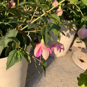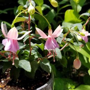 🧚エンジェルスイヤリング🧚 親株で切り戻しましたが、又咲いています。もう片方は、もう少しかかりそうですね😅 改良されてきているので、木陰であれば西日本の夏を越すことができるようになったそうです。 冬は霜にあたると落葉💦でも春には又芽を吹き、毎年開花するそうです。ハンギングで、ゆらゆらする姿は愛らしいですね❣️ アカバナ科フクシア属