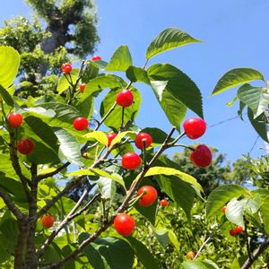暖地さくらんぼ🍒 一年目でいっぱい実がなりました 全く甘くないので水を切ってみたら だんだん甘くなりました
