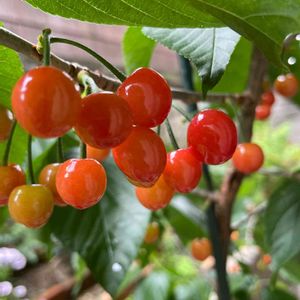 さくらんぼ🍒可愛く実ってたんですけど、雨で実が割れてしまいました😭収穫して食べてみましたが酸っぱいです。残っている数粒が美味しくなりますように🙏