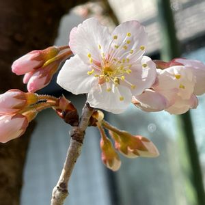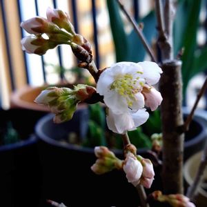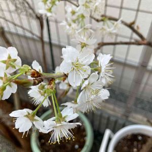 暖地桜桃が開花しました🍒 先週買ってきたのにもう開花! 一年目から咲くなんて強すぎる! 摘花した方がいいと思うのでこれから調べます😳
