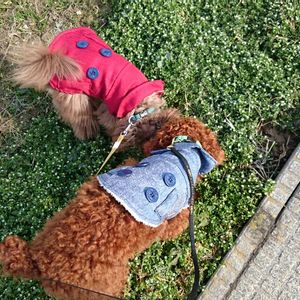 ②ワンコお揃いの服でお散歩♪ と思って見てたんですが、どうもトイプーの方が丈が短すぎ💦サイズ間違って買ったのかなぁ~ ぁ~あ…と思って家に帰って見てみたら 逆に着せてただけでした😆 良かったぁ無駄にならなくて😆