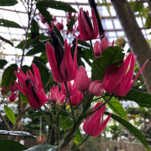 派手で奇妙な姿に思わずパシャリ。😁 周りの赤いのが花だと思ったら、これは「苞」、真ん中の黒いのが「花」、だとすれば黒い口から突き出たものは「雄しべ」か「雌しべ」なのでしょうか❓🤔 (グリーピア春日井)