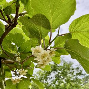 今日のお花🏷️キウイフルーツ(🥝'^'🥝) 定点観測中の神代植物公園のキウイ棚。 花は何だか面白い形です❣️華やかで花木としても良いのでは!05月18日📸。薔薇フェスタの日にちょうど見頃です。 シルバーウィーク、涼しくなって来園者多数❗️大芝生ではしゃぐ親子連れのすぐ横でひっそり収穫の時を迎えています。🤫ヒミツ(o>Д<)bです。11月04日📸