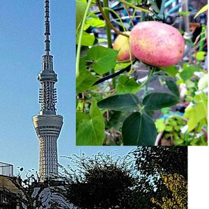 今朝の散歩🚶から 朝陽🌄に輝く東京スカイツリー 📷️ am6:30 ホソバヒイラギナンテン