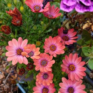 ①3年目!!ちょっとビックリ👀!!の耐久性(土は少なくほぼヤシガラチップ)のオステオスペルマム ②今年最初のペチュニア(タキイ種苗さんのものだと思う)←調べてから載せろ💦 ④これも3年目のブラキカム ⑤職場の中庭に移動させた ラックスのケラモス(コレは造花⁉️と質問多く、そう思われがち)
