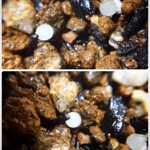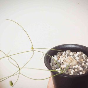 シゾバシス・イントリカータの蔓の先に小さな袋。種が入ってたので、小皿に土を入れ種蒔き。霧吹きでそっと水やりしていたら・・芽が出ました🌱