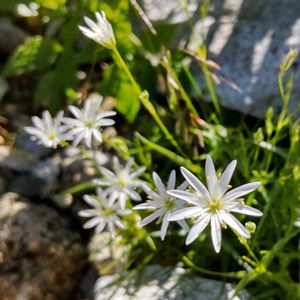 岩爪草(イワツメクサ) ナデシコ科ハコベ属の多年草。高山帯の砂礫地に生える。高さ10〜20㎝。よく分枝して株立ちになる。葉は線形で長さが3㎝ほどあり先端は鋭く尖る。葉は数対、基部付近にわずかに縁毛がある。茎の上部の葉は長さ2〜4㎝。花期は7~9月。花は直径約1.5㎝、1〜7個がまばらな集散状につく。花柄は長さ2〜8㎝、無毛。花柄が長いので強い風が吹くと花はいっせいになびく。萼片は鋭尖頭。花弁は萼片の長さの1.5〜2倍。花弁は5枚だが、基部近くまで2裂し10個のように見える。雄しべは10個。花柱は長さ2〜3㎜で、外側に曲がる。蒴果は萼片とほぼ同長。種子は縁に微細な柱状突起を密生する。 学名のステラリアはstella(星)からきた語で、花が星形をしていることに由来する。 出典『山に咲く花』『夏の野草』