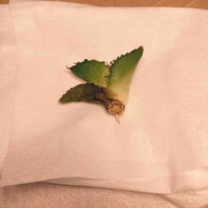 ヤバ〜い( ̄▽ ̄;) やっぱり葉っぱ腐ってた〜( ̄▽ ̄;) 根っこもまったく伸びてな〜い💦 どうしよう?(´;ω;`) どうしよう?(´;ω;`) とりあえず、腐った部分取り除いてベニカぶっかけて、乾燥させるか……
