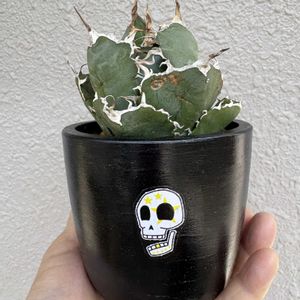 今まで沢山のアガベを育ててきましたが、水遣り以外は基本放ったらかしなんで、徒長する株も多々(-。-; 植物も人と同じで色んな株がありそれぞれの育て方があるので、今回はお手頃な価格で入手できたのと、湿度や日照の管理もして徒長しないように、ファンを付けて、成長用のライトも購入。このまま綺麗な形で成長を見届けたいです^_^ 数年前にハマってたリメ鉢の道具が捨てずにあったので、セリアで100円プラ鉢買って、カッコよくブラックに塗り、スカルのデコパもやってみました。