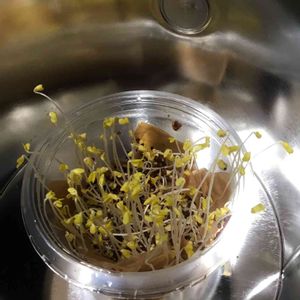 蓋付きの間の中で、ブロッコリースプラウトを栽培中🌱