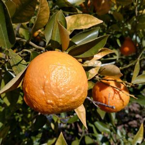 橙(ダイダイ) ミカン科ミカン属の常緑小高木。インドのヒマラヤ地方が原産とされ、西に伝わったものがサワーオレンジ、東に伝わったものが橙とされる。日本には鎌倉時代に中国から伝わった。橙はレモン、ライムに次いで世界三大香酸柑橘類(こうさんかんきつ💬糖の含量が少なく酸含量の高い柑橘の中で、芳香に富むのも。ユズ、スダチ、カボスなど)に入る。日本はスペインとともに世界的な産地になっている。静岡県の伊豆半島、和歌山県田辺市などが産地として有名。果肉は酸味が強いのでそのままでは食用にならず、絞って酢の代わりに使った。乾燥させたものを焚いて蚊を避けた。漢方薬の橙皮(とうひ)は果実の皮を乾燥させたもので、消化不良などに用いる。欧米では『サワーオレンジ』という名前で、マーマレードの材料に用いられる。苦味があるので『ビターオレンジ』ともいわれる。花から採れる香料『ネロリ』はアロマテラピーに使われる。病気に強いこともあって、ミカン類の接ぎ木の台木としても利用される。 花期は5~6月。花は純白で花弁は5枚。雄しべは多数の花糸が基部でつながり筒状、雌しべは1本。果実には2種類ある。臭橙(カブス)は果皮が濃い橙色で特有のにおいがあり200gほどで、袋数は10〜12個。回青橙(カイセイトウ)は座橙とも呼ばれ、果実は小さく150gほど。 名前の由来には諸説ある。冬に橙色に熟す果実を枝についたままにしておくと、翌夏には緑色に戻る。これを『回青現象(かいせいげんしょう)』という。冬になると再び色づき、この現象を2〜3年繰り返す。そのため1つの木に1代目、2代目、3代目などと『代々』の果実が実るのでダイダイとなった説。へたが2重で台が重なっている『台々』であるという説や、中国語の『橙』の発音に由来するという説、柚子の仲間の中でも果実が特に大きいので『大々』の意味という説もある。江戸時代には『代々栄える』という縁起物として正月の飾りになった。鏡餅の上に載せるのは本当はみかんではなくダイダイ。また、別名の臭橙(カブス)は果皮に特有の臭気があるのでつけられたという。 出典『食材図典』『図説 果物の大図鑑』『フルーツひとつばなし』『薬草の呟き』『樹木の名前』