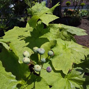 《デカい🌿シリーズ》 これも前後に裂け目の入った独特の形の葉っぱですけど、ブルーの果実を付けていました💙 今年は結局は花は見れなかったなあ… この青い実、いちおう食べれますけど、私は美味しいとは思わないなぁ…美味しいと書いてあることも多いですけどねえ😅 花は雨とかに濡れると神秘的な透明になるので有名ですが、この花とっても繊細ですぐに花弁は取れてしまうし、咲いてるのもとても短くて、ピークの状態で見るのはなかなか難しい。 葉は大小2枚セットで出てますが、まずほとんど花は小さい葉の方に着きます😆